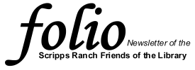 Folio is the official bulletin of the Scripps Ranch Friends of the Library. Folio is published periodically throughout the year, is mailed to all members of the Scripps Ranch Friends of the Library, and is made available to the general public at the Scripps Miramar Ranch Library Center and electronically via this website. In addition to communicating announcements, events, and other information to the members of the Friends, Folio is used to publicize the Scripps Ranch Friends of the Library to prospective members. Issues of Folio available for online viewing and printing are: