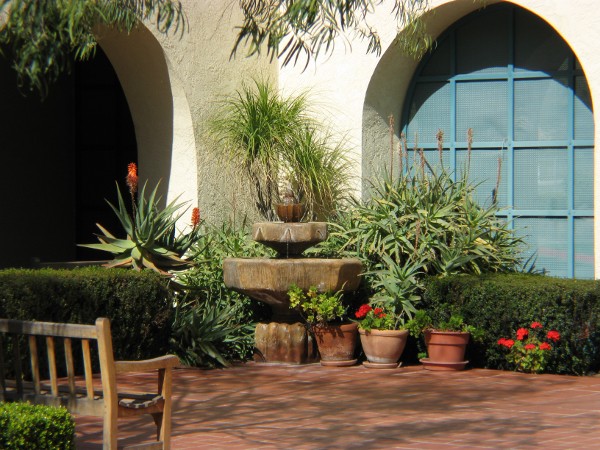 The central courtyard of the Scripps Miramar Ranch Library Center echos the courtyard of the Thomas and Nackey Scripps Meanley family home, upon which land the Library Center is built. (Click photo to enlarge.)