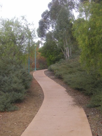 A short walk along a paved, lighted walkway will take you from the circle at the end of Meanley Drive up a gentle hillside to the Scripps Miramar Ranch Library Center. (Click photo to enlarge.)