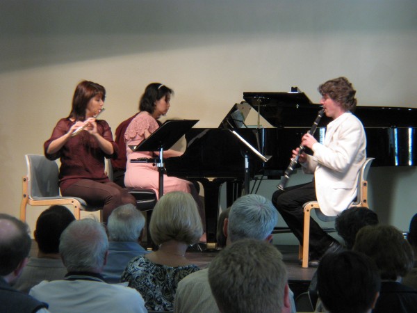 The March 2009 concert featured music for piano, clarinet, and flute. Miho Gary, pianist, was born in Japan and graduated from the San Francisco Conservatory of Music. She is a member of Music Teachers Association of California. Elena Yárritu, flutist, has performed extensively in the San Francisco Bay Area, New York, and abroad in France, the Netherlands, and in Eastern Europe. Clarinetist Matt Gill is a graduate of Oberlin College. The concert included the Carmen Fantasy, Time Pieces by Muczynski, and music by Pleye. (Click photo to enlarge.)