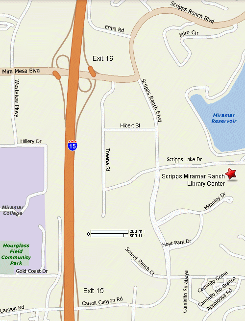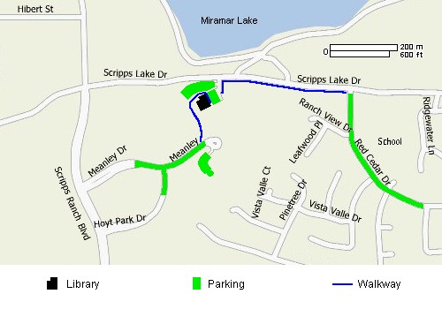 The entrance to the Scripps Miramar Ranch Library Center is located in Scripps Ranch a few hundred feet west of the entrance to Miramar Lake on Scripps Lake Drive. Patrons arriving from outside the Scripps Ranch area are advised to take the Mira Mesa Boulevard exit (Exit 16) off I-15 east to Scripps Ranch Boulevard, turn right (south) onto Scripps Ranch Boulevard, then turn left (east) onto Scripps Lake Drive to reach the Library. Alternatively, patrons can take the Carroll Canyon Road exit (Exit 15) off I-15 east; continue straight from Carroll Canyon Road onto Scripps Ranch Boulevard (north), then turn right (east) onto Scripps Lake Drive to reach the Library Center. (==> Click Here <==) for a printable version of the location map. ![]() Parking